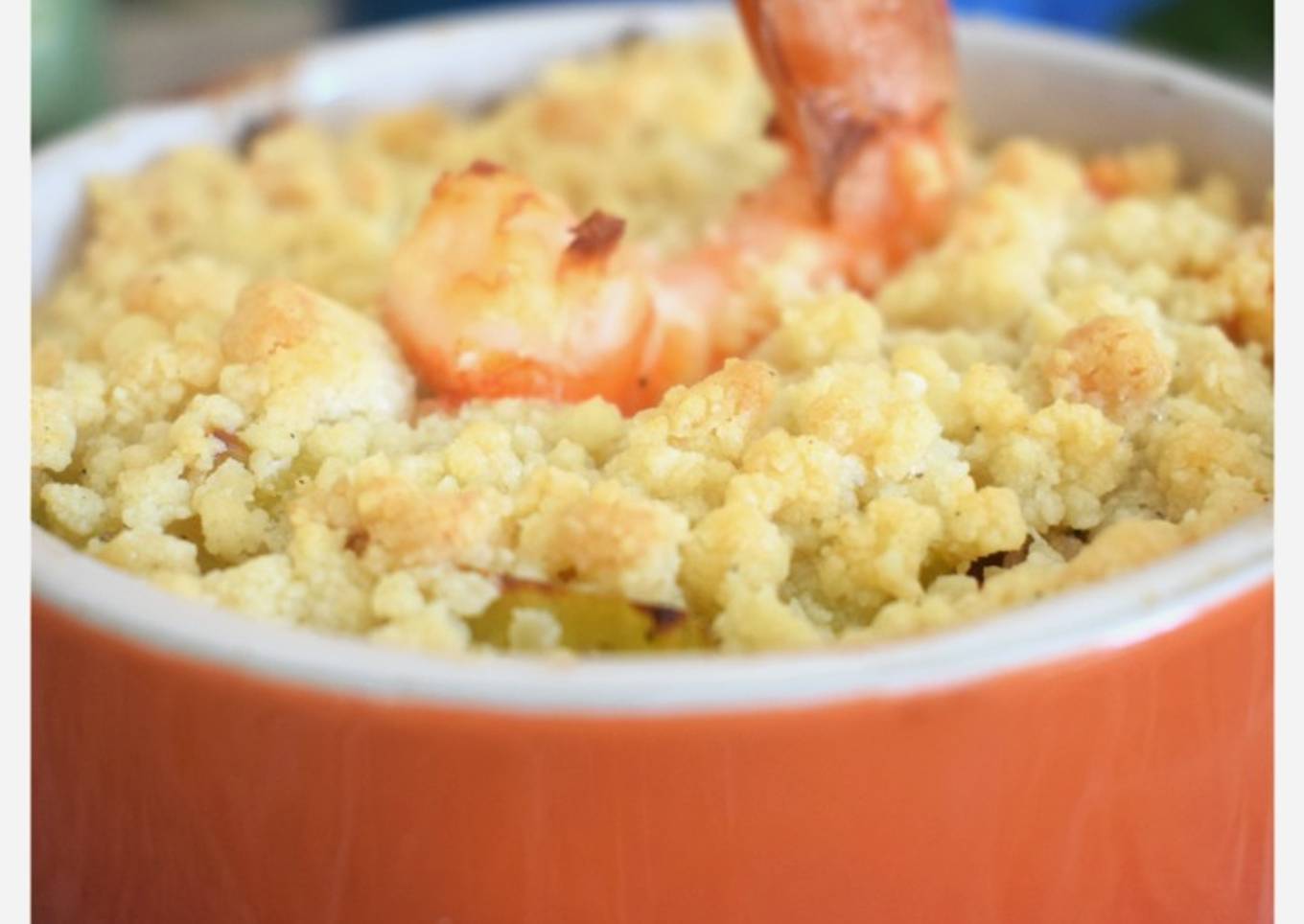 - Répartir dans les cocottes et recouvrir généreusement de crumble. Piquer une crevette et enfourner pour 15 à 20 minutes jusqu'à ce que le crumble prenne des couleurs.