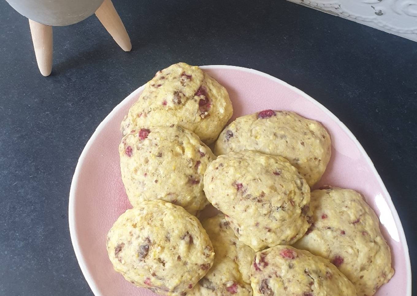 - 100 g pépites de chocolat ou noix ou fruits (j'ai mis ici 3 rochers choco/noisettes émiétés et quelques framboises surgelées que j'ai également émiettées