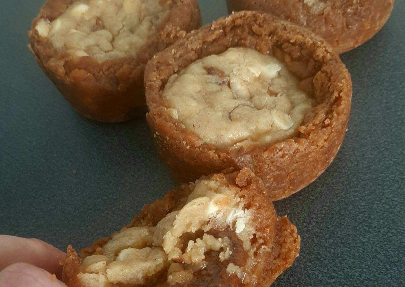 Le brookie c'est un dessert né de l'association du brownie et du cookie, autrement dit un concentré de gourmandise. Ma recette est une version individuelle sur une base de blondie (un genre de brownie sans chocolat) inspiré du blondie trouvé sur le blog de Gallymini Pâtisse avec un coeur de praliné pécan !